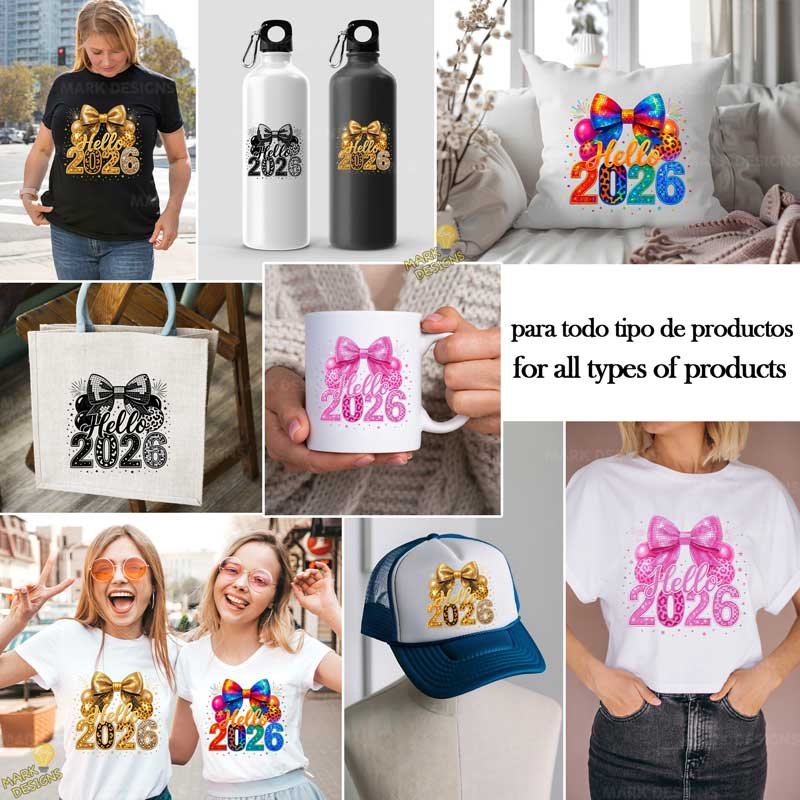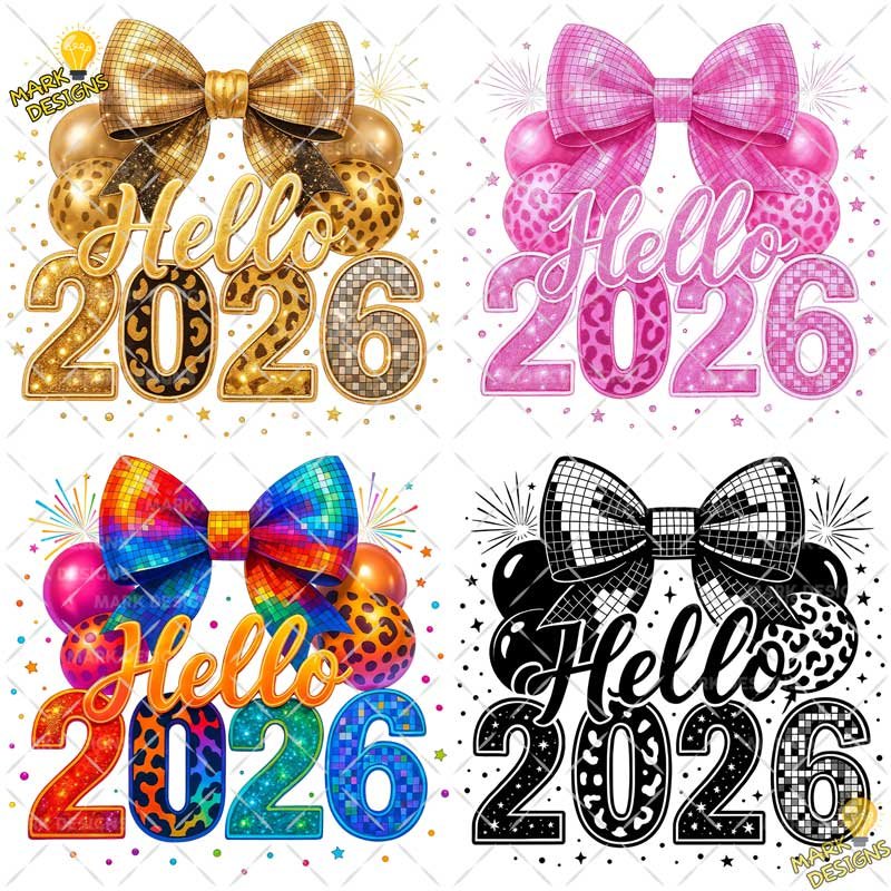 4 Diseños Hello 2026 PNG para Sublimación, ideal para utilizar en tus proyectos o sublimación de tazas, camisetas, Tumblr, vasos, cojines, scrapbooking y más, además están listas para descargar, imprimir y personalizar.