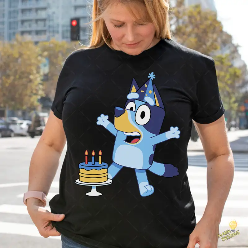 Bluey con Gorro de Fiesta y Pastel de Cumpleaños – Vector Sublimación
