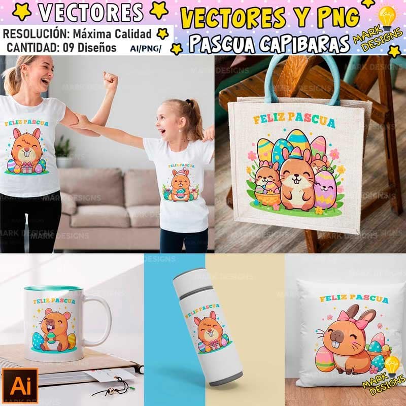Capybaras de Pascuas PNG y Vectores, pueden ser utilizados en una gran variedad de impresiones, incluyendo: Pósters, Camisetas, Tarjetas de invitación, Stickers y pegatinas, Decoración para cumpleaños, Impresiones de pared, Tazas y tumbler, Sublimación, Merchandising, etc.