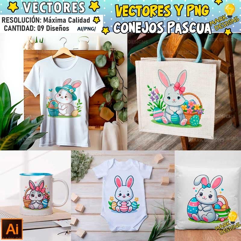 Conejos de Pascua Png y Vectores, pueden ser utilizados en una gran variedad de impresiones, incluyendo: Pósters, Camisetas, Tarjetas de invitación, Stickers y pegatinas, Decoración para cumpleaños, Impresiones de pared, Tazas y tumbler, Sublimación, Merchandising, etc.