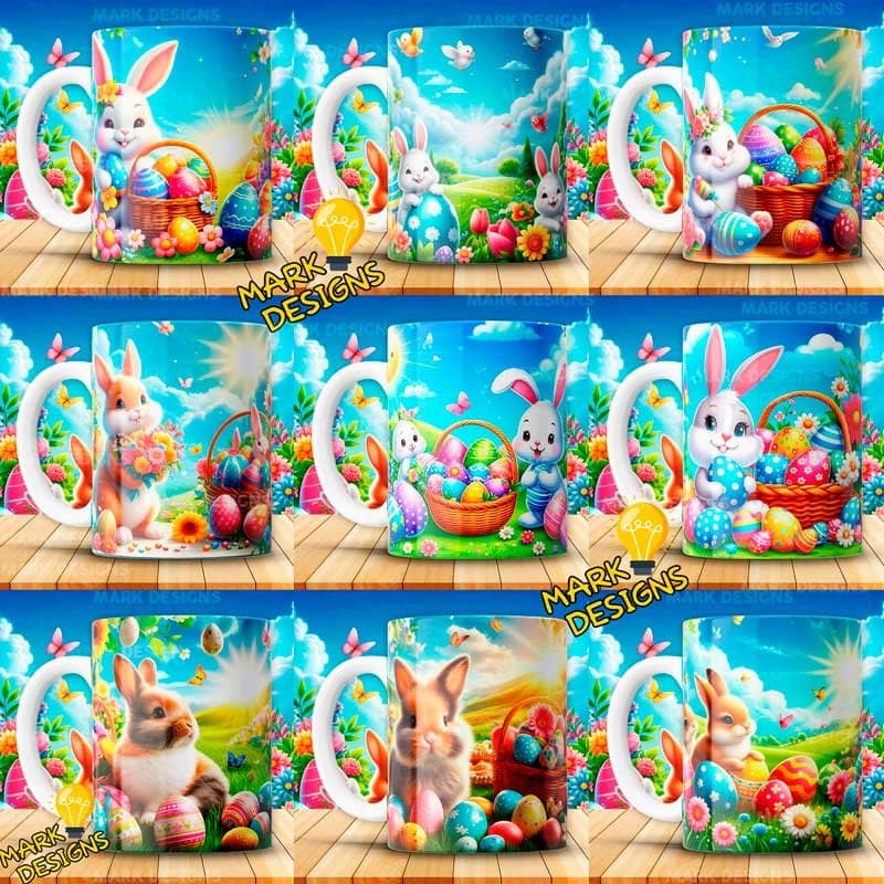 Conejos Pascuas para sublimar Tazas, ideal para estampar tus tazas, además están listas para imprimir y sublimar.