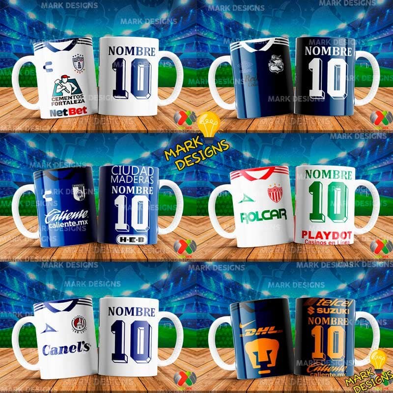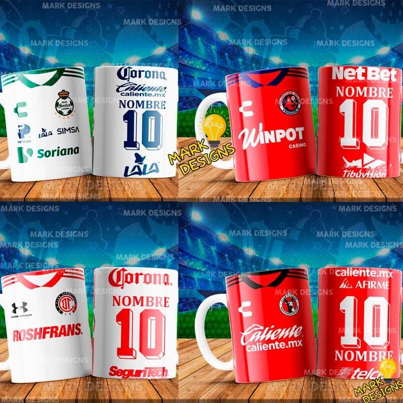 Diseños Fútbol Mexicanos para Tazas editables tipo camiseta ideal para poner nombres personalizados, listas para imprimir y sublimar.