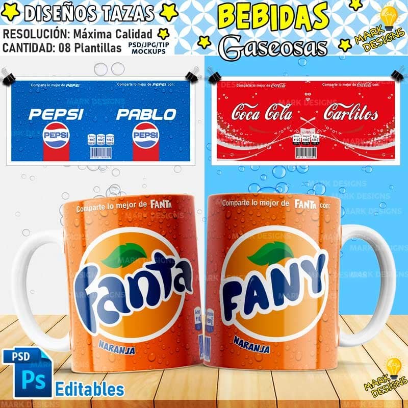 Diseños Gaseosas para Tazas Editables, ideal para estampar tus tazas, listas para imprimir y sublimar.