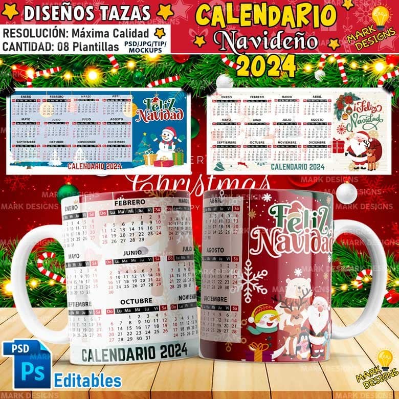 Diseños Calendario 2024 Navideños para Tazas ideal para empresas o comercios, ideal para sublimar tus tazas, listas para imprimir y sublimar.