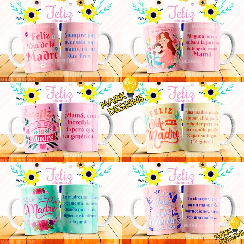 Plantillas para sublimar tazas Día de la Madre listos para imprimir y sublimar. Descarga este hermoso pack de diseños para tazas por el día de la madre y crea tazas únicas y duraderas. Diseños con frases para mamá tazas. Aumenta tu catálogo con este increíble pack y aumente sus ventas. Diseños de Frases Mamá para Tazas.