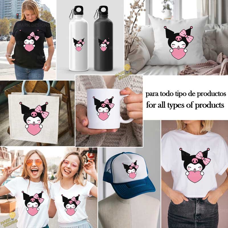 Kuromi corazón san Valentín PNG ai, ideal para utilizar en tus proyectos o sublimación de tazas, camisetas, cojines, Tumblr, gorras, bolsas, termos, llaveros, mousepads, agendas, tarjetas de invitación, botellas, fundas, cuadros, posters, stickers, DTF, etc.! además están listas para descargar, imprimir y personalizar.