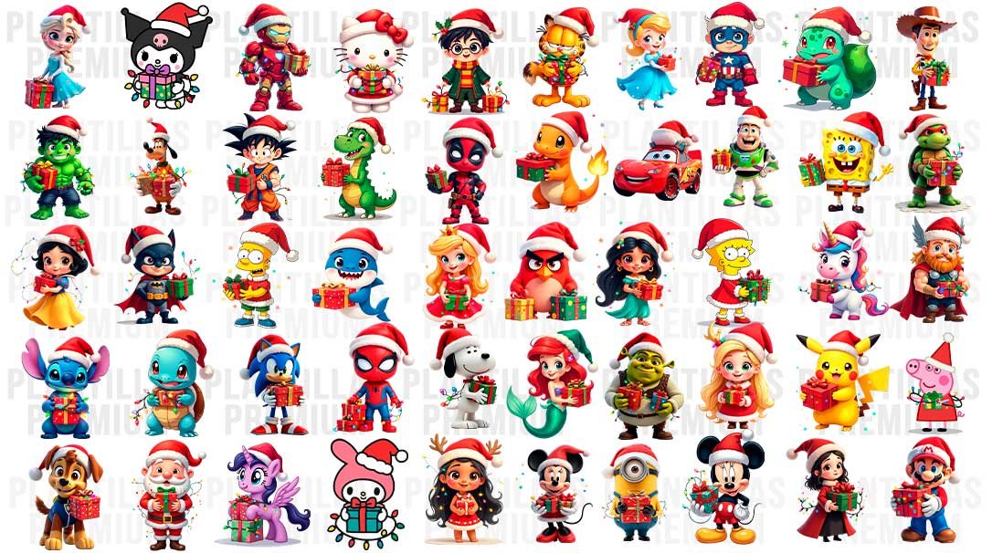 Personajes infantiles navideños png, 50 archivos, pueden ser utilizados en una gran variedad de impresiones, incluyendo: Pósters, Camisetas, Tarjetas de invitación, Stickers y pegatinas, Decoración para cumpleaños, Impresiones de pared, Tazas y tumbler, Sublimación, Merchandising, etc. En este pack de Navidad encontrarás plantillas de los personajes infantiles más populares con la temática navidad.