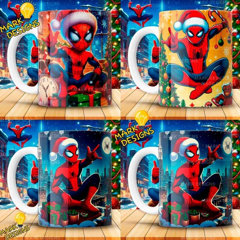 Plantillas Spiderman Navideños Tazas, ideal para estampar tus tazas, además están listas para imprimir y sublimar.