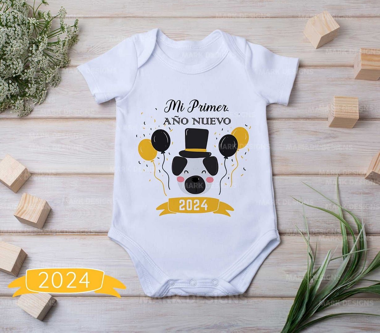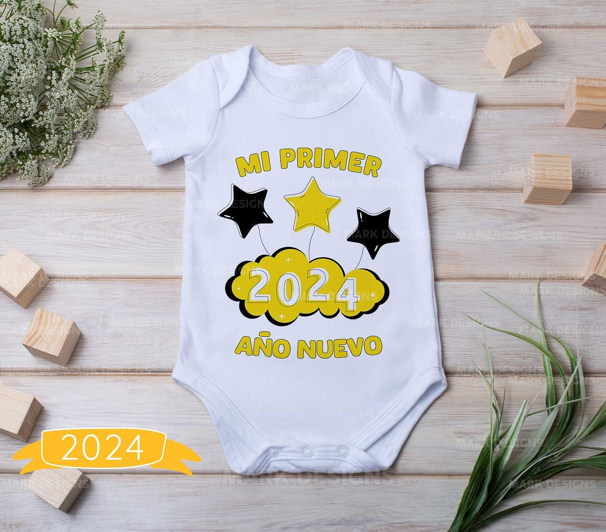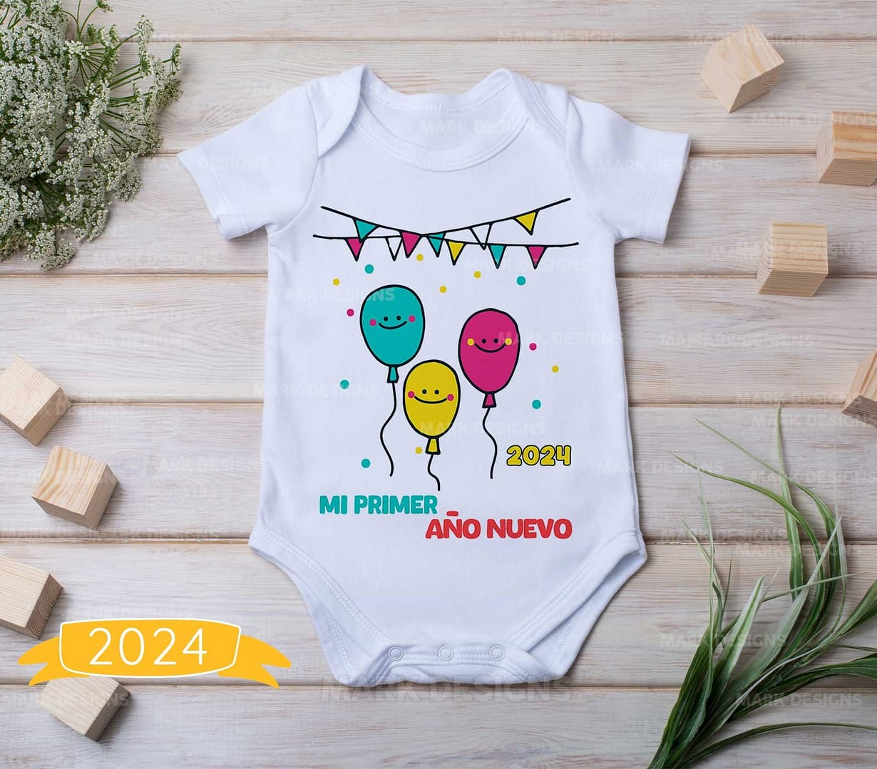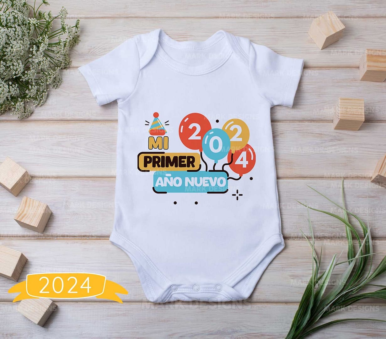 Primer Año Nuevo 2024 para Bebés Diseños Editables, ideal para sublimar tus camisetas, listas para imprimir y sublimar.