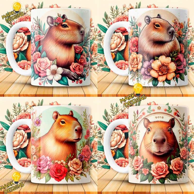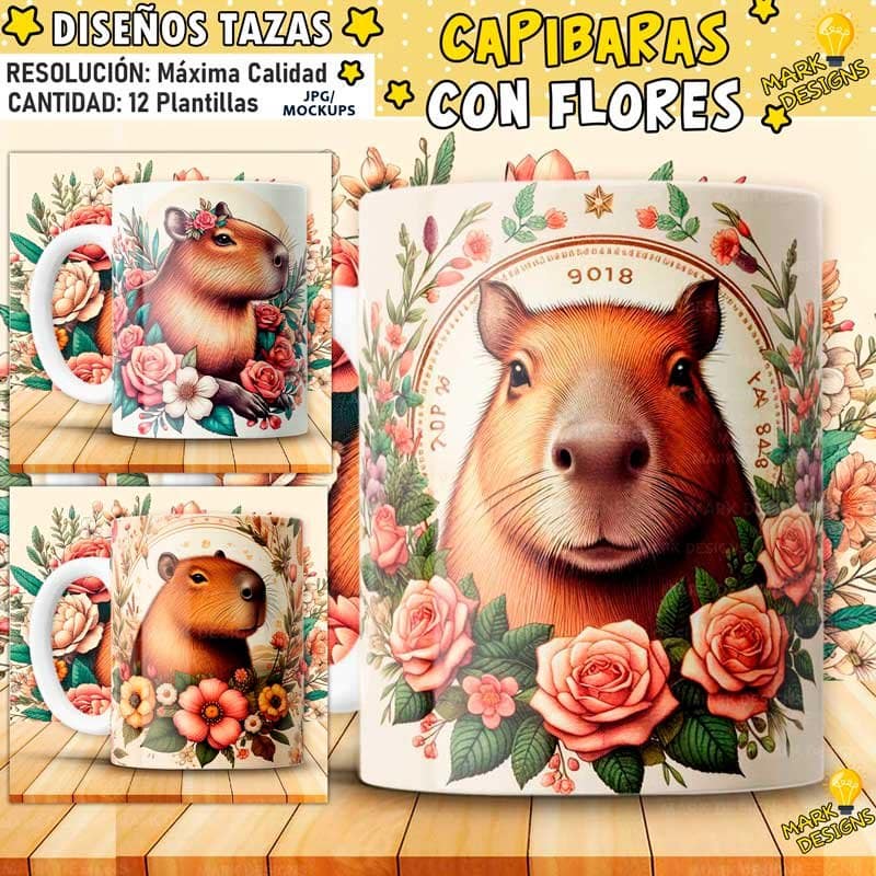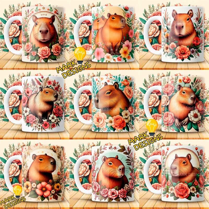 • Contenido: 12 diseños de Taza capibara plantilla con flores.
