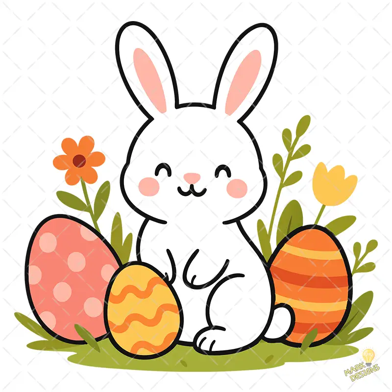 Conejito Kawaii con Huevos de Pascua y Flores – Diseño Vectorial y PNG 4K