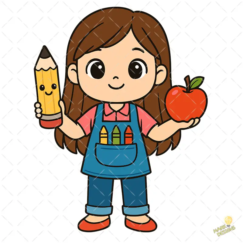 Maestra Jardinera con Lápiz Kawaii y Manzana – Diseño Vectorial y PNG 4K