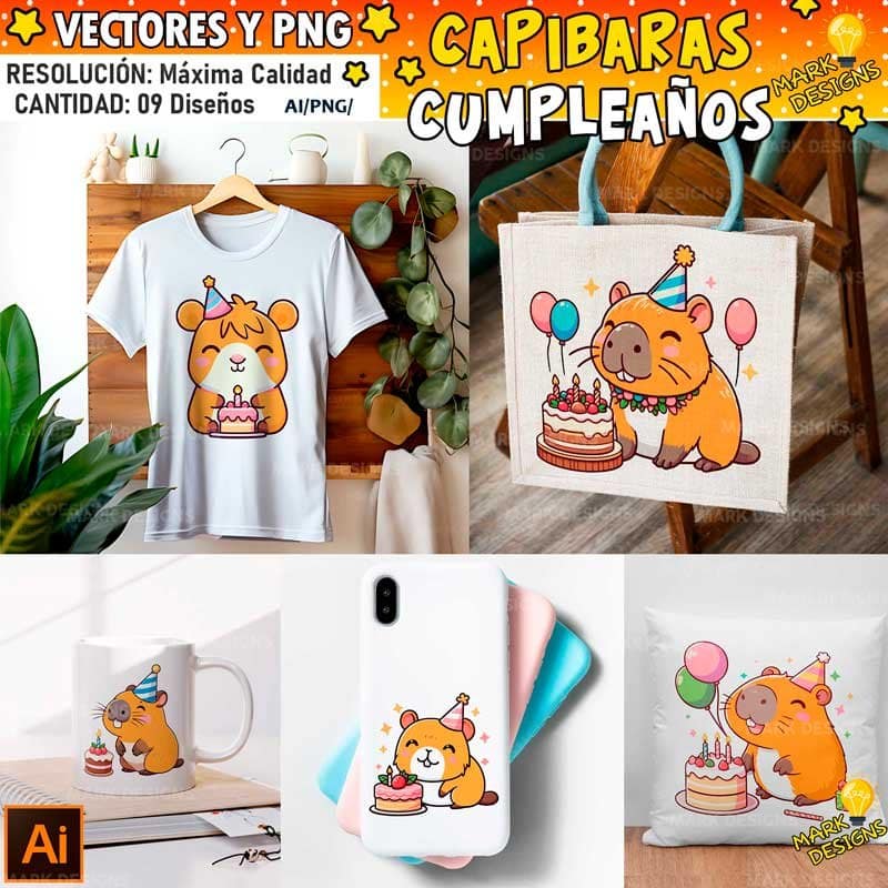 Vectores Capibaras Cumpleaños y Png, además puede adaptarlas para usarlas en tazas, termos, almohadones, etc listas para imprimir y sublimar.
